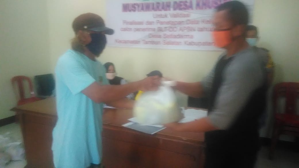 Pendataan warga yang menerima bansos melalui dana desa ini dilakukan oleh pemerintah desa dibantu oleh RT dan RW, Bhabinkamtibmas,Babinsa kemudian diverifikasi melalui Musyawarah Desa Khusus, Ungkap Kades Setiadarma Hj.Nunung Herwati.