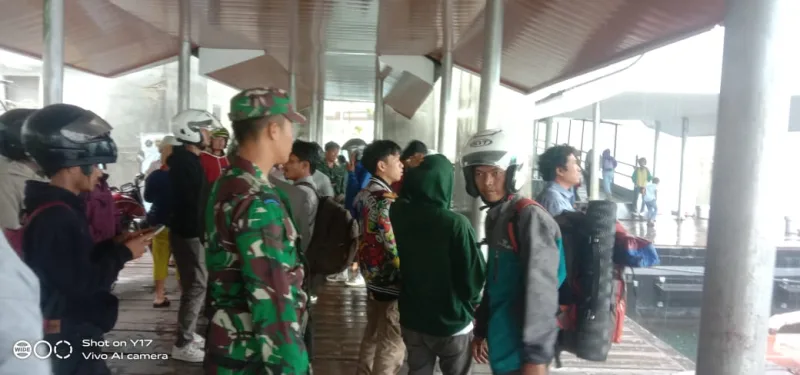 Babinsa Koramil 15/Dolok Pardamean Kodim 0207/Simalungun Serda Julhalim melaksanakan komsos dengan masyarakat yang berkunjung ke pelabuhan tigaras
