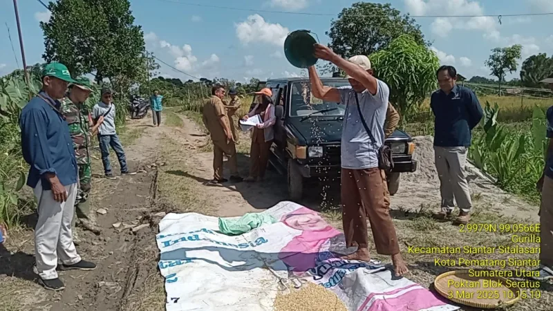 , 3 Maret 2025 – Dalam upaya meningkatkan hasil pertanian dan mendukung ketahanan pangan, Bintara Pembina Desa (Babinsa) Koramil 01/ Siantar Utara Kodim 0207/ Simalungun Serda Sumihar Hasibuan, Bersama Dinas Pertanian Kota Pematangsiantar dan kelompok tani (Poktan) Blok 100 melaksanakan kegiatan pengumbinan padi di lahan pertanian milik bapak Martua Purba. di Kelurahan Tanjung Pinggir, Kecamatan Siantar Martoba, Kota Pematang Siantar.