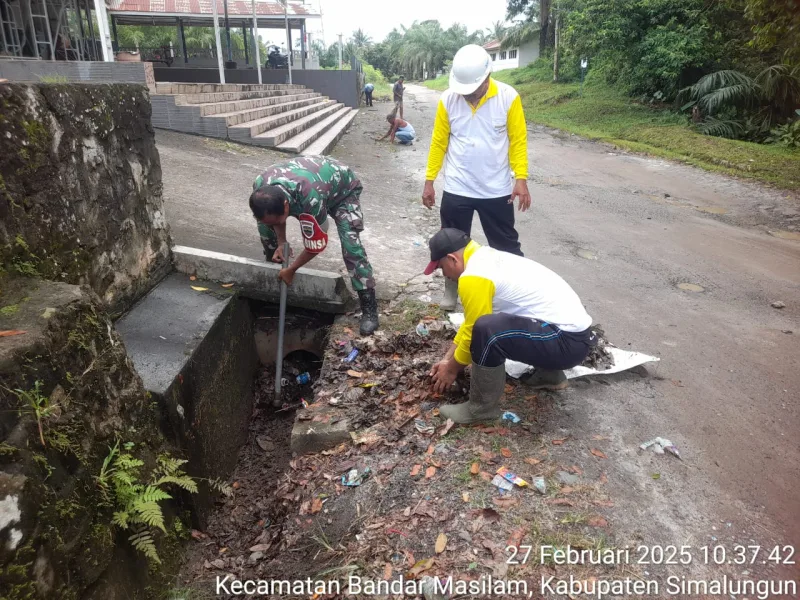 Dalamrangka menyambut bulan suci Ramadhan, Babinsa Koramil 06/Perdagangan, Sertu Sutikno, bersama warga Nagori Partimbalan melaksanakan kegiatan gotong royong di Masjid Jamik Al Hikmah, Kecamatan Bandar Masilam, pada Kamis, 27 Februari 2025.