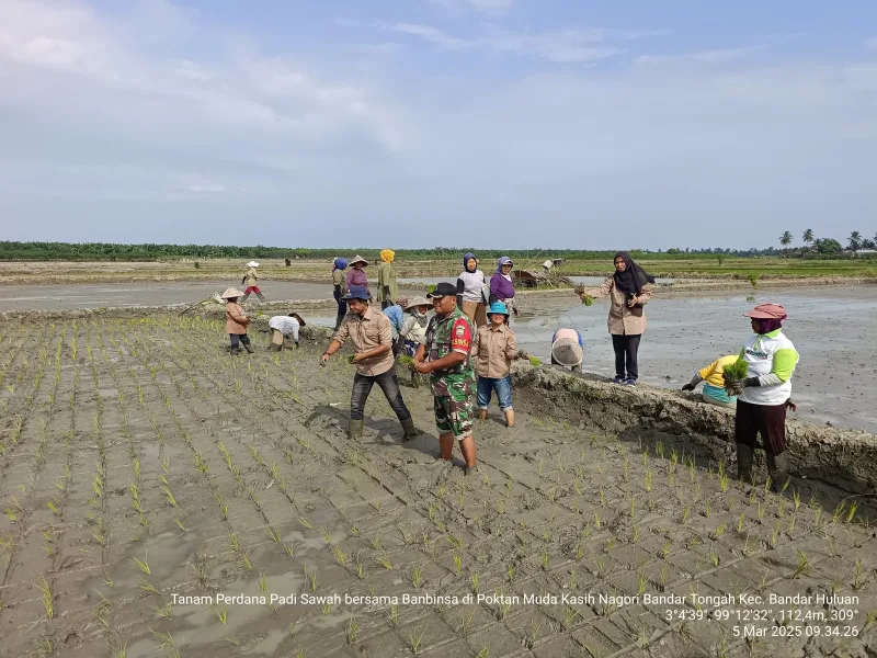 Babinsa Koramil 06/Perdagangan, Serka Yuniaman, aktif mendukung program ketahanan pangan dengan melaksanakan kegiatan Percepatan Hanpang LTT (Luas Tambah Tanam) di Nagori Bandar Tongah, Kecamatan Bandar Huluan, Kabupaten Simalungun, pada Rabu (5/3/2025).