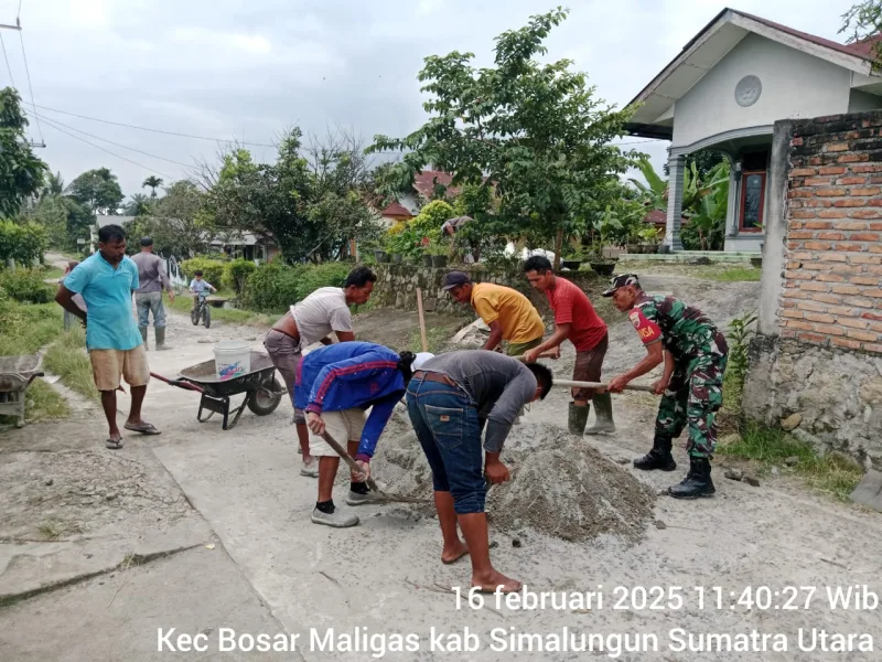 Babinsa Koramil 07/Bosar Maligas, Jajaran Kodim 0207/Simalungun, Sertu Jeri Agustian, melaksanakan kegiatan komunikasi sosial sekaligus aksi nyata dengan membantu warga melakukan pengecoran jalan berlubang di Nagori Parbutaran, Kecamatan Bosar Maligas, Kabupaten Simalungun, Minggu (16/2/2025).
