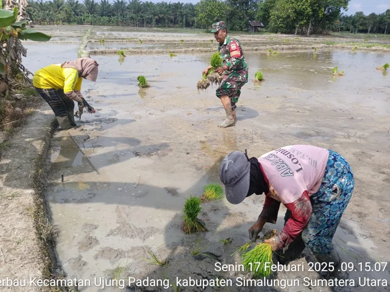 Babinsa Koramil 07/Bosar Maligas, Sertu Suratno, melaksanakan pendampingan ketahanan pangan (hanpang) dengan membantu penanaman bibit padi varietas unggulan di lahan seluas 15 rante milik Bapak Ramses Tampubolon. Kegiatan ini berlangsung pada Senin, 17 Februari 2025, bersama kelompok tani Merbau Jaya di Nagori Se’i Merbau, Kecamatan Ujung Padang, Kabupaten Simalungun.