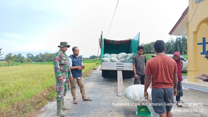26 Februari 2025 – Babinsa Koramil 08/ Bangun Kodim 0207/Simalungun, Koptu Marmuyidi, Bersama Tim Bulog Pematang Siantar melaksanakan kegiatan pendampingan kepada Kelompok Tani Trubus I dengan Ketua Kelompok Tani Eriston Silalahi, Petani Ibu fitri br pardede dalam rangka penyerapan gabah sebanyak 1.086 Kg, hasil panen petani diHuta VII Batu 5 , Nagori Silau malaha , Kecamatan Siantar, Kabupaten Simalungun.