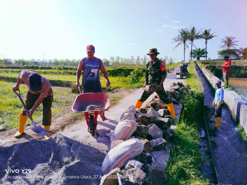 Semangat gotong royong kembali ditunjukkan oleh Babinsa Koramil 08/Bangun Kodim 0207/Simalungun, Serka Edi Sunarto, yang pada hari Minggu (27/04/2025) turun langsung bersama Pangulu, perangkat desa, dan para petani untuk memperbaiki tembok penahan saluran irigasi di Nagori Karang Sari, Kecamatan Gunung Maligas, Kabupaten Simalungun.