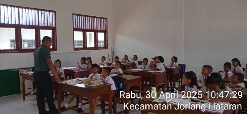 30 April 2025 – Babinsa Babinsa Koramil 09/ Tiga Balata Kodim 0207/ Simalungun Babinsa An.Serda A Simorangkir melaksanakan kegiatan pembinaan wawasan kebangsaan (wasbang) kepada siswa/siswi SD 091488 Bah Sampuran,Kecamatan Jorlang hataran Kabupaten Simalungun. Kegiatan ini bertujuan untuk menanamkan kedisiplinan, rasa cinta tanah air, serta memperkenalkan nilai-nilai kebangsaan sejak usia dini.