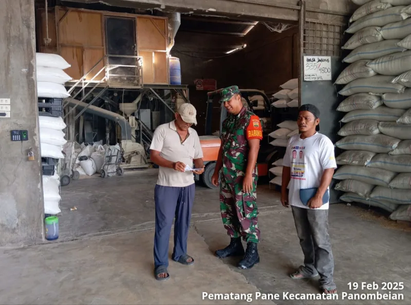 , 19 Februari 2025 – Dalam rangka mendukung ketahanan pangan dan memastikan stabilitas harga gabah/beras, Babinsa (Bintara Pembina Desa ) Koramil 16/Panei Tonga Kodim 0207/SML Serma Bobby Manurung, melakukan kegiatan Komunikasi Sosial (Komsos) dengan pemilik UD Hendra Putri Kembar, yang merupakan salah satu pelaku usaha yang telah menjalin kerja sama dengan Perum Bulog dalam penyerapan gabah/beras di Nagori Panombeian Pane, Kecamatan Panombeian, Kabupaten Simalungun.