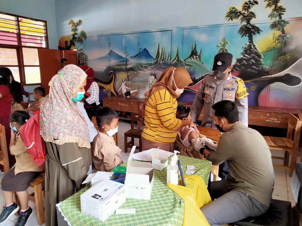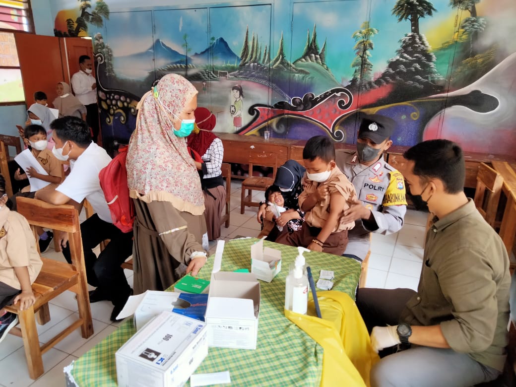 Bripka Rio melaksanakan pemantauan dan pengamanan kegiatan vaksinasi yang bekerja sama dengan Tim Nakes dari Ciputra Hospital menggunakan Vaksin jenis Sinovac ditujukan kepada siswa siswi SD Negri Rancaiyuh IV usia 6 tahun sampai 11 tahun sebanyak 113 orang.