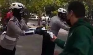Sambil tergopoh-gopoh dan sempat terjatuh, mereka tetap semangat mengimbau masyarakat agar patuh dalam berkendara dan menjaga protokol kesehatan.