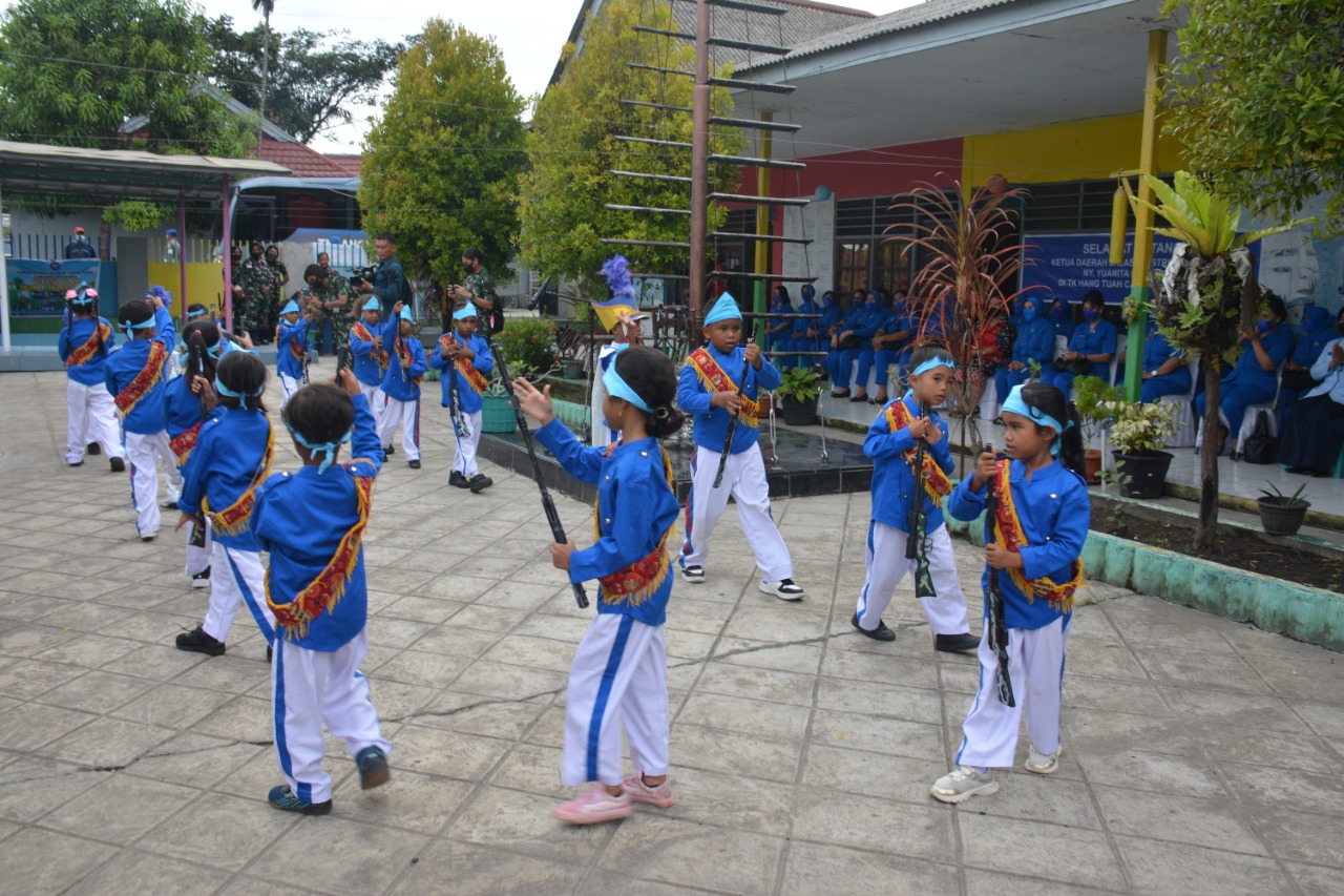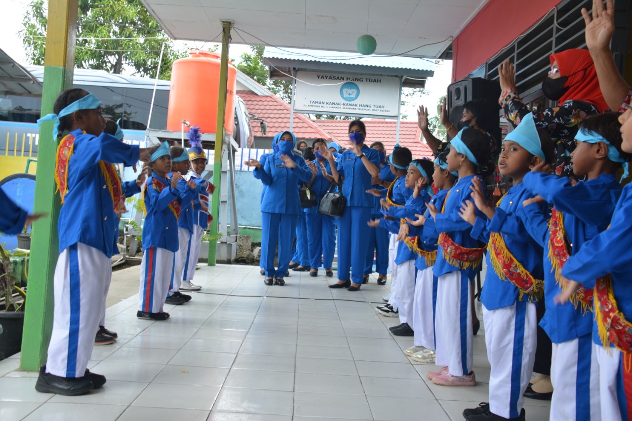 Begitu tiba di Hamadi Ketua DJA III langsung menuju TK Hangtuah Jayapura di sambut dengan penampilan memukau atraksi Kolone Senjata dan melihat aktivitas Murid Siswa Siswi TK Hangtuah Jayapura serta memberikan bingkisan.