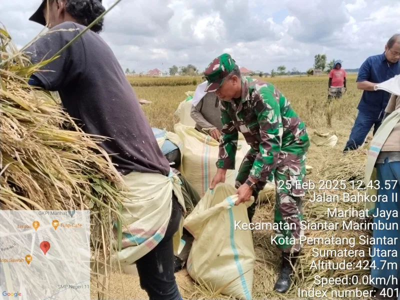 Danramil 03/ SS Kapten inf Teguh Sugiono bersama Babinsa Kopda Winky gunawan dan Perwakilan dari Bulog Bapak Aryo Wibisono dan Zefi Nanda dan PPL Kelurahan Pematang Marihat Bapak Golfrit Sinaga, melaksanakan pendampingan dan membantu petani memanen padi di sawah di Kelurahan Pematang Marihat Kecamatan Siantar Selatan Kota Pematangsiantar.Selasa (25/2/2025)