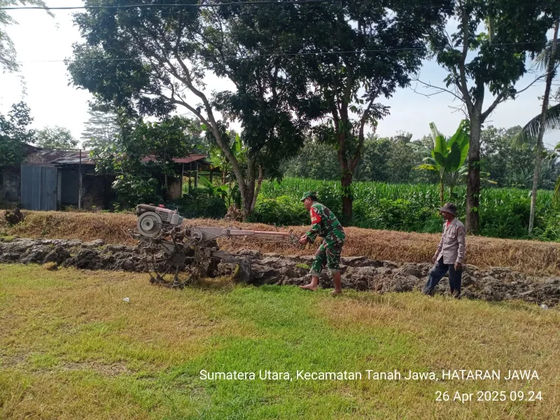 26 April 2025 — Dalam rangka mendukung program ketahanan pangan nasional, Babinsa Koramil 10/Tanah Jawa Kodim 0207/Simalungun, Sertu Misno, melaksanakan kegiatan pendampingan pertanian dengan membantu pengolahan lahan milik warga di Nagori Marubun Jaya, Kecamatan Tanah Jawa, Kabupaten Simalungun.