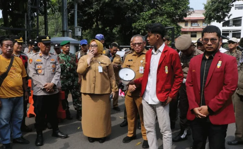 Lia Dahlia, Kepala Bagian Hukum Setda Kota Tangerang ditemani Asisten Pemerintahan dan Kesejahteraan Rakyat, Deni Koswara menemui massa aksi, Senin 15 September 2025 sore.( Ilham)