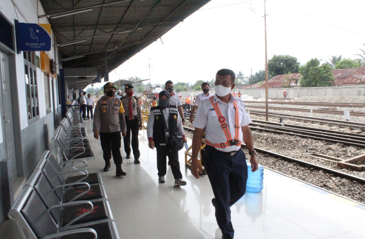 LABUHANBATU,poskota.net-Kapolres Labuhanbatu Akbp Agus Darojat SIK. MH diwakili Kabag Ops Kompol Marluddin S. Ag dan Kasat Sabhara Akp Amdi karna SH meninjau langsung stasiun Kreta Api Rantauprapat menjelang rencana dibukanya jalur transportasi umum dan kesiapan tatanan hidup baru, pada unit angkutan massal milik PT. Kreta api Indonesia cabang rantauprapat, selasa (16/06/2020) sore.