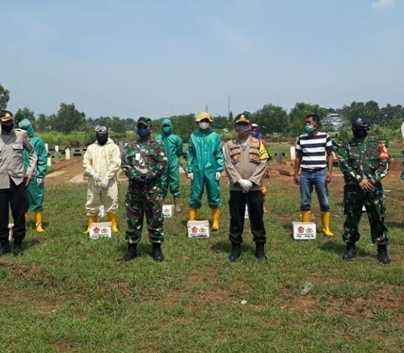 Kapolres Metro Bekasi Kota Kombes Pol. Widjonarko Sik, MSi bersama Dandim 0507 Bekasi Kolonel. Inf Rama Pratama, MSi secara simbiolis menyerahkan paket sembako kepada petugas pemusalaran jenazah TPU Padurenan.