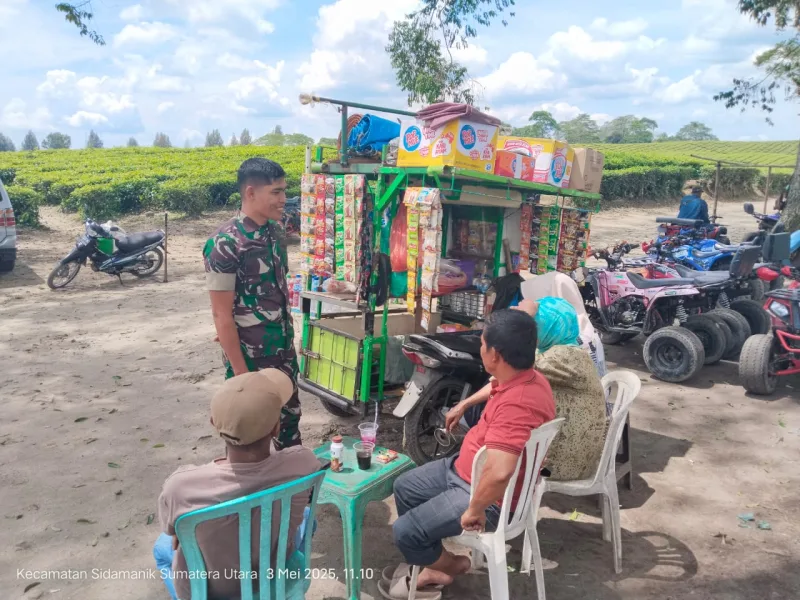 3 Mei 2025 – Dalam rangka mempererat komunikasi dengan warga serta menjaga keamanan dan kenyamanan di kawasan wisata, Babinsa Koramil 17/Sidamanik Kodim 0207/Simalungun, Serda J. Aritonang, melaksanakan kegiatan Komunikasi Sosial (Komsos) bersama masyarakat yang tengah berwisata di objek wisata Kebun Teh Sidamanik, Nagori Bahbutong Satu, Kecamatan Sidamanik, Kabupaten Simalungun, pada Sabtu (03/05).