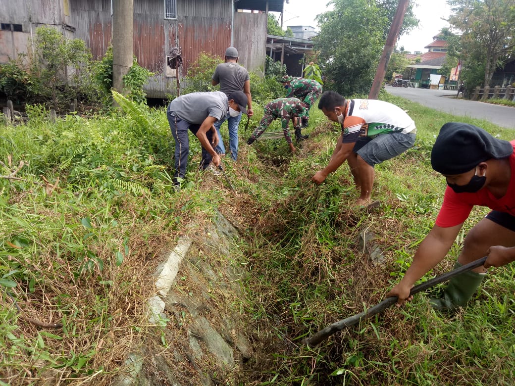 KOTAWARINGIN BARAT- Personel Koramil Kumai bersama warga melaksanakan kerja bhakti pembersihan saluran air yang tertutup sampah dan rerumputan, di Kelurahan Kumai Hulu, Kecamatan Kumai, Kabupaten Kotawaringin Barat.