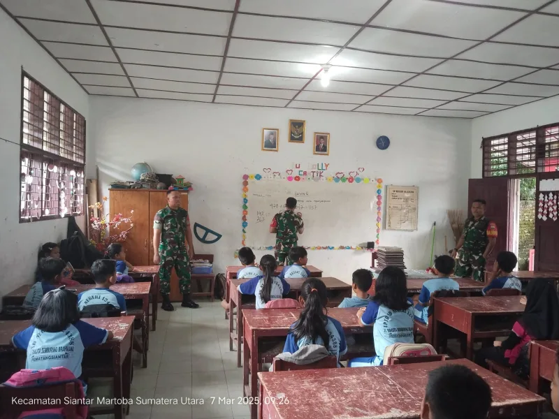 , 7 Maret 2025 – Salah satu peran Babinsa (Bintara Pembina Desa) dalam mendukung dunia pendidikan diwujudkan melalui kegiatan pengajaran di Sekolah Dasar. Pada hari ini, Koramil 01/Siantar Utara Kodim 0207/ Simalungun Serda J.Sinurat, melaksanakan kegiatan pengajaran Matematika dasar dengan menggunakan metode Gasing (Gerakan Asah Siswa dengan Giat) di UPTD SDN (Sekolah Dasar Negeri) 124388 di Jln Rakutta Sembiring Kelurahan Naga pita Kecamatan Siantar martoba Kota Pematang Siantar.
