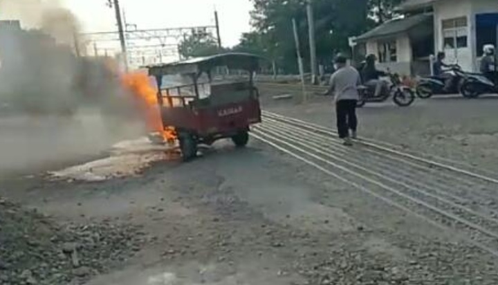CIKARANG Poskota.net- Nasib sial dialami Jauhari (28) pengendara motor roda 3 (tiga) jenis TOSA. Kendaraan yang ia pakai untuk berjualan tahu bulat ludes terbakar si jago merah tepat di pintu perlintasan kereta api Gatot Subroto, Kec. Cikarang Utara, Kabupaten Bekasi, Rabu (13/05/2020) sekitar pukul 16.00 WIB sore tadi.