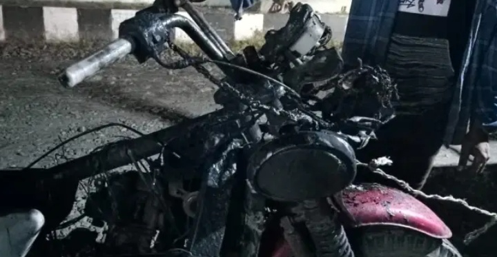 Melihat kejadian tersebut, pengendara dan penumpang dengan cepat langsung memadamkan api dengan alat seadanya.