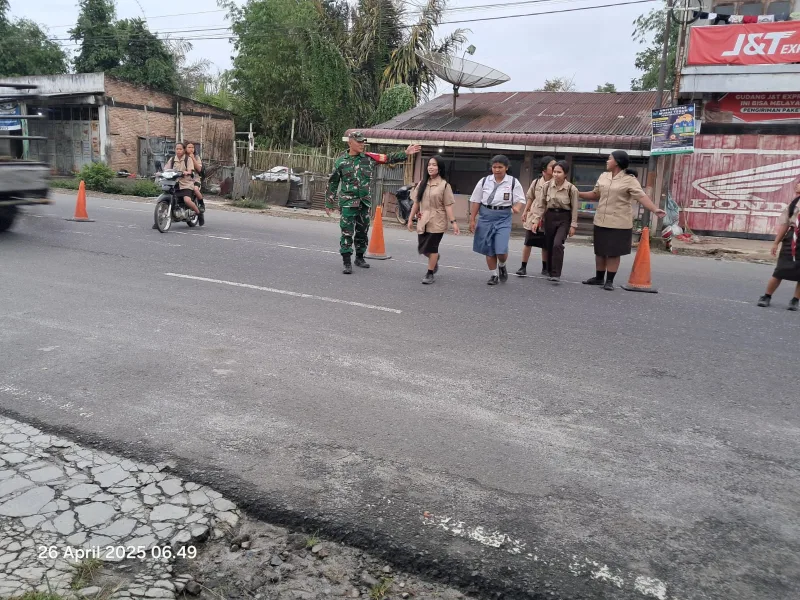 , 26 April 2025 — Sebagai bentuk kepedulian terhadap keselamatan para pelajar, Babinsa Koramil 14/Raya Kodim 0207/Simalungun, Sertu Darlijon Purba, melaksanakan kegiatan Komunikasi Sosial (Komsos) dengan membantu penyebrangan anak-anak sekolah di depan SMK Swasta GKPS 1 Raya, Kelurahan Pamatang Raya, Kecamatan Raya.