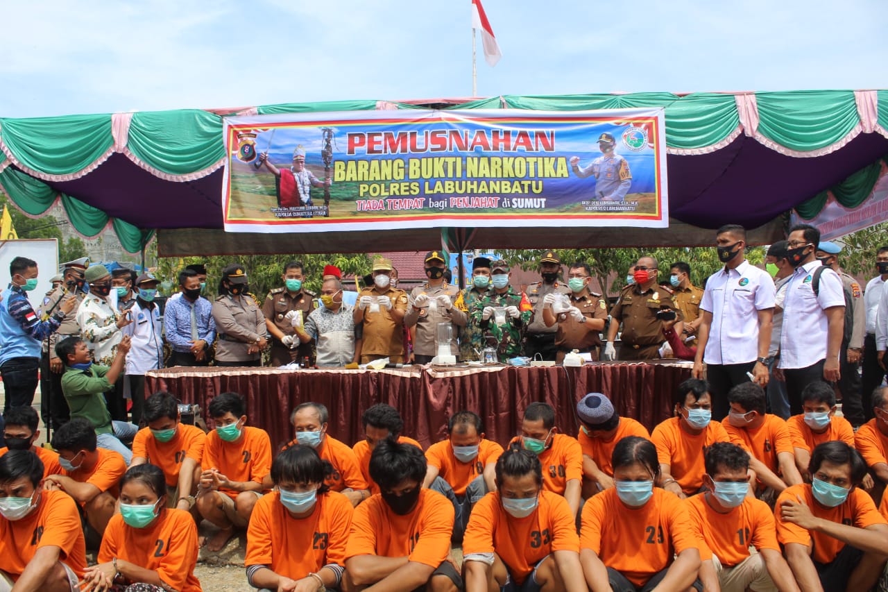 Kapolres menyampaikan pada kesempatan ini juga Polres Labuhanbatu dan Polsek jajaran berhasil mengungkapkan kasus Tindak Pidana Narkotika selama sebulan terhitung dari 28 Agustus 2020 sampai dengan 28 September 2020 yaitu sebanyak 46 KSS dengan jumlah tersangka 60 orang yaitu 58 Orang Laki Laki dan 2 Orang Perempuan dengan barang bukti Narkotika Golongan I bukan tanaman jenis Sabu seberat 363,48 dan 1 (satu) butir Pil Exstasy seberat 0,18 Gram dan Ganja 3,01 Gram