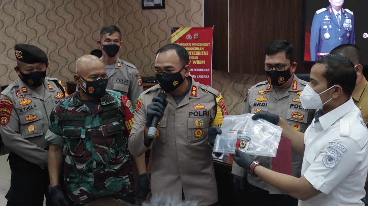 Pada Konferensi Pers tersebut diperlihatkan barang bukti yang diamankan antara lain; satu buah Handphone Samsung Galaxy Grand Prime warna Putih, Empat lembar Screenshot bukti percakapan Tersangka kepada pihak keluarga. Satu unit kendaraan sepeda motor merk Honda Supra X warna Hitam Nopol Z-2333-AB, dan satu buah helm.