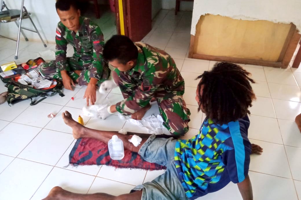 MERAUKE,poskota.net- Aksi sigap kembali diperlihatkan Personel Satgas Pamtas RI-PNG Yonif MR 411/PDW Kostrad Pos Kaliwanggo saat mengobati korban kecelakaan lalu lintas, yang dialami dua pengendara sepeda motor Jupiter Z PA 5514 GX dengan sepeda motor Kawasaki KLX tanpa plat di Jalan Trans Papua, Distrik Sota.