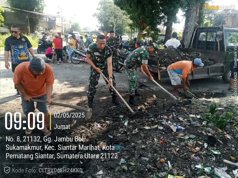 Jum’at 2 Mei 2025 — Wujud nyata kebersamaan dan kepedulian terhadap lingkungan kembali ditunjukkan oleh jajaran TNI dan masyarakat. Personel Koramil 03/Siantar Selatan Kodim 0207/ Simalungun  Sertu G Simanjuntak dan orang  personil bersama Bhabinkamtibmas, perangkat kelurahan, serta masyarakat sekitar melaksanakan kegiatan gotong royong di Jl. Jambu Bol, Kelurahan Suka Rakyat, Kecamatan Siantar Marihat, Kota Pematang Siantar.