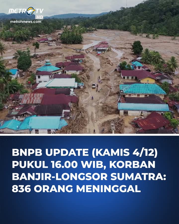 Berdasarkan data terbaru dari Badan Nasional Penanggulangan Bencana (BNPB) yang dirilis pada Kamis, 4 Desember 2025, pukul 16.00 WIB, jumlah korban meninggal akibat bencana banjir dan longsor di wilayah Sumatra telah meningkat menjadi 836 orang. Kejadian ini mengakibatkan dampak yang sangat serius terhadap masyarakat dan infrastruktur di daerah terdampak.