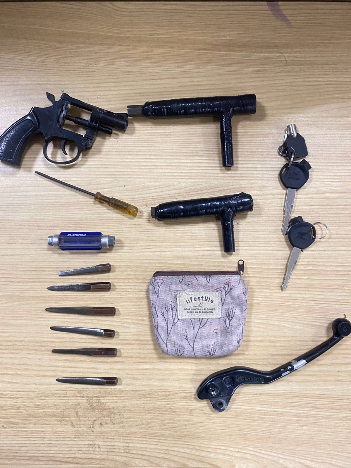 Polisi turut mengamankan sejumlah barang bukti berupa dua unit sepeda motor Honda Vario, alat-alat pembobol kendaraan, telepon genggam, serta benda menyerupai senjata api.