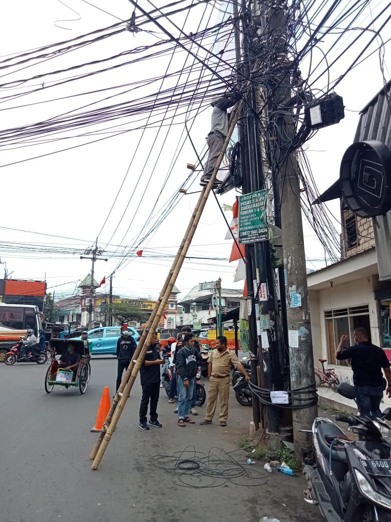 Pemerintah Kota Tangerang Selatan melalui Dinas Pekerjaan Umum bertindak tegas dengan menertibkan tiang dan kabel milik provider internet (Poskota.net/Dok Ist)