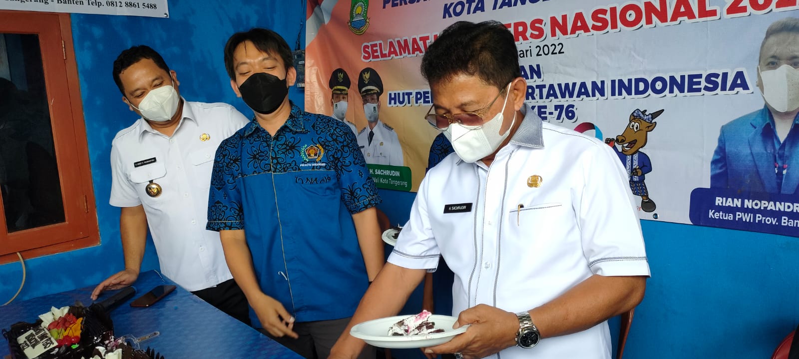 Arif datang ke sekretariat bersama (Sekber) PWI, jalan KS. Tubun, Kerawaci Kota Tangerang, Rabu (09/02/2022 ) didampingi oleh Wakil Wali Kota Sachrudin, Kabag Humas serta Pejabat lainnya.