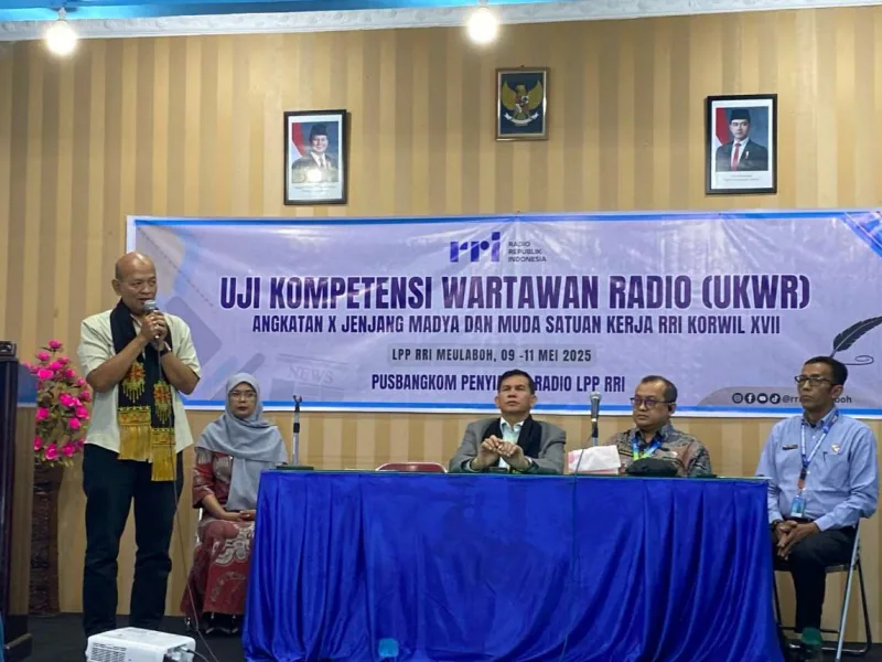 Meulaboh:Poskota.Net-Dewan Pengawas (Dewas) LPP-RRI, Enderiman Butar Butar, S.P., M.Si., secara resmi membuka Uji Kompetensi Wartawan Radio (UKWR) X se-Aceh di Aula Tri Prasetya RRI Meulaboh, Jumat (9/5/2025). Acara pembukaan ditandai dengan simbolis pemukulan rapai sebagai bentuk semangat pelestarian budaya lokal.