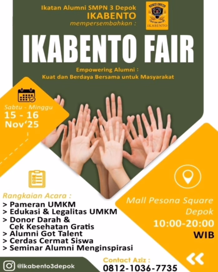 “Kami ingin alumni hadir sebagai bagian dari solusi. Lewat Ikabento Fair, kami dorong semangat kemandirian, kolaborasi, dan kepedulian sosial agar alumni SMPN 3 Depok bisa terus memberi inspirasi,” ungkapnya.